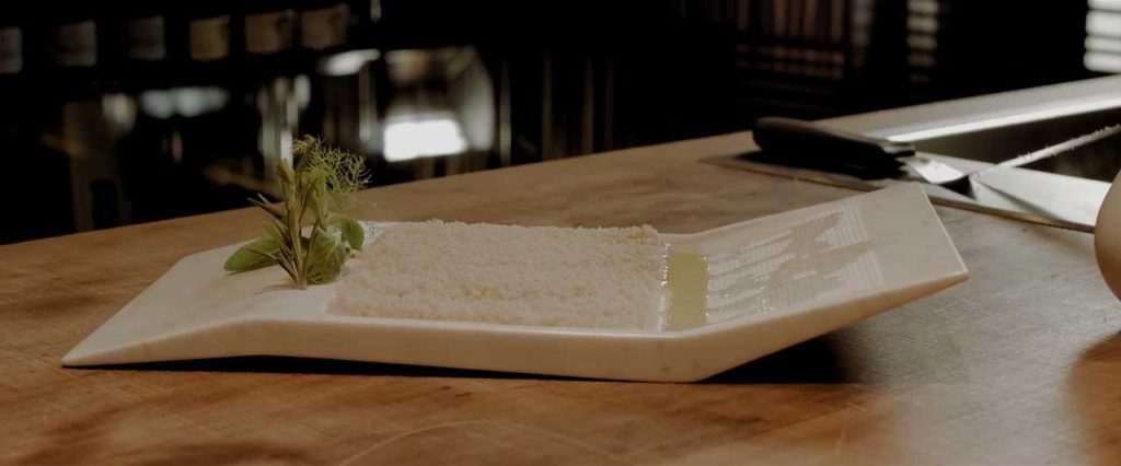 Lo studio di architettura luoghiCOMUNI ha disegnato uno straordinario piatto per uno chef che non ha bisogno di presentazioni, Filippo La Mantia, con il più nobile dei materiali: il marmo di Carrara fornito da una firma celebre come It’s Stone rappresentata dall’Azienda Fratelli Marmo.